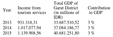 Tourism has the strategic role of increasing and supporting national economic development (Adu-Ampong, 2018). In Indonesia, this sector is a major source of foreign income that employs national labor and encourages foreign investment. Bappeda Jabar Humas (2005) mentions that tourism should be strengthened and given special attention, in terms of implementation and development, to create a thriving regional economy in general and especially in Garut District.