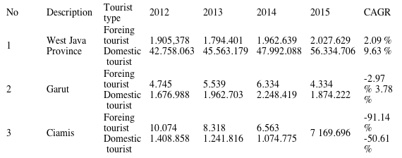 In the table above, the contribution of tourism to the total GDP of Garut District’s is still small, at around 3%. Therefore, the potential of tourism should be developed so that such contribution increases in the future. Table 2 shows historical data of tourist visits to the West Java Province, Garut District, and Ciamis Distric.