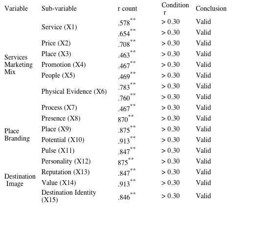 The survey was conducted by a team of researchers at Santolo beach in southern Garut. The instrument used to collect the data was a questionnaire administered to visitors of said beach. The design of the research instrument was based on three research variables: services marketing mix, place branding, and image. The questionnaire was composed of closed-ended questions that were answered using a Likert scale from 1 to 5. In this paper, validity and reliability were supported if the Pearson correlation coefficient was greater than or equal to 0.30 (r ≥ 0.3).