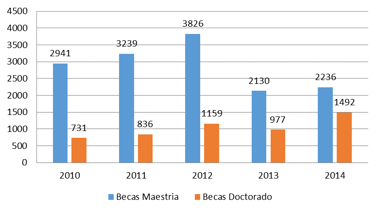 En el periodo comprendido de 2010 a 2014, se observa que, en Colombia, solo en el año 2010, se asignaron 2941 becas/créditos de maestría y 731 de doctorado (ver Figura 3), observamos. Para el año 2011 hubo un incremento en estos apoyos, subiendo a 3239 en las becas/créditos de maestría y 836 de doctorado. En el 2012 continúa el incremento, siendo el año en donde se evidencia en productos de impacto un mayor resultado: 2826 becas/créditos para maestría y 1159 para doctorado. En los dos últimos años del periodo a revisar, las cifras bajan. En 2013, las becas/créditos asignados para maestría caen a 2130 y las de doctorado a 977. Finalmente, en el año 2014 se entregaron 2236 becas/créditos de maestrías, pero a su vez, se entregó el mayor número de becas de doctorado: 1492 (Lucio et al., 2015).