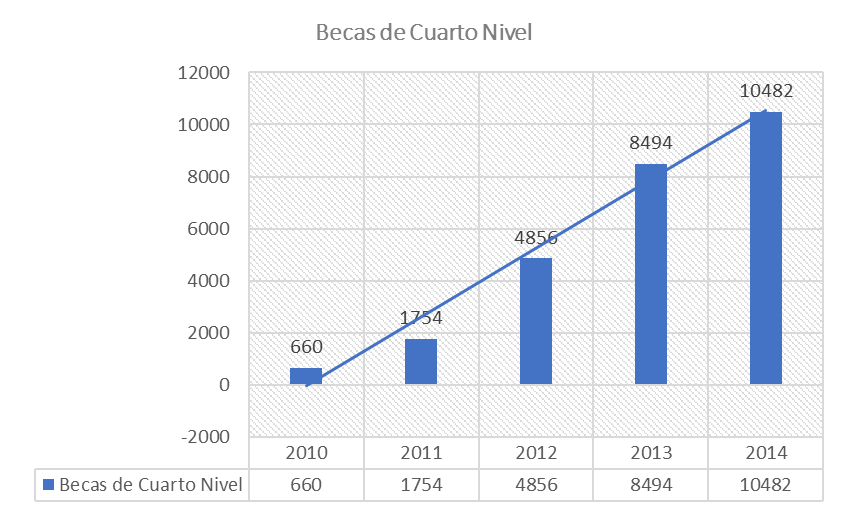 Con estos antecedentes es posible explicar el porqué de la gran inversión destinada a la profesionalización de talento humano en Ecuador y pasar de entregar 660 becas para estudios de cuarto nivel en el 2010 a 10482 becas en el año 2014 (ver Figura 4). Durante este periodo, Ecuador es el país de América Latina que entrega la mayor cantidad de becas al año con relación al tamaño de su población: 2.27 por cada 10000 habitantes, seguido por Brasil con 1.64; Chile 0.55; y México 0.13 (Senescyt, 2014).