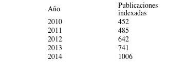 Con estos antecedentes se puede observar que, en Ecuador, entre los años 2010-2014 (ver Tabla 10), como resultado de las políticas públicas implementadas, y gracias a la inversión realizada en CTI, las publicaciones indexadas crecieron de manera sostenida, pasando de 452 en el 2010, hasta llegar a 1006 publicaciones en el 2014, esto de acuerdo a la información reportada en la base de datos Web of Science.