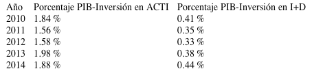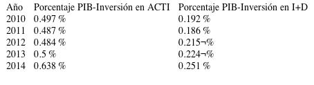Al revisar los datos discriminados de las inversiones en ACTI, se observa que para el año 2010 la inversión en estas actividades fue equivalente al 0.497 %, mientras que en 2011 bajó ligeramente a 0.487 % (ver Tabla 1). Igualmente es importante resaltar que el presupuesto asignado a Colciencias en 2010 fue equivalente a 232 287 millones de pesos y representó el presupuesto más alto asignado a esa entidad hasta ese momento. Esto significó un incremento del 67 % con respecto al año 2009 (Consejo Privado de Competitividad de Colombia, 2011). La inversión en ACTI, en los años 2012 y 2013, subió ligeramente. Cabe resaltar que, según un informe publicado por el Departamento Administrativo Nacional de Estadística (DANE, 2014), el subsector que más reportó inversión en ACTI en 2012 fue el de educación superior, con un monto de USD 214253000, seguido del subsector de actividades bancarias, con $107976000 (estas inversiones fueron reportadas en pesos colombianos; sin embargo, para efectos de este artículo se adaptaron a dólares estadounidenses, teniendo en cuenta la tasa de cambio representativa del mercado [TRM]) de diciembre de 2012 [1 USD=1.768]). En 2013, nuevamente el subsector de educación superior fue el que reportó una mayor inversión en ACTI, con un monto correspondiente a $278198000. Correos y telecomunicaciones ocuparon el segundo lugar, con una estimación de $247189000. Al revisar los datos del año 2014, al cierre del primer gobierno e inicio del segundo periodo del expresidente Juan Manuel Santos, se observó que el incremento en inversión para ACTI continuaba. En el Plan Nacional de Desarrollo (DNP) 2014-2018, se estableció la meta de aumentar la inversión en ACTI hasta el 0.9 % del PIB al finalizar este periodo (Departamento Nacional de Planeación [DNP, 2014). Para 2014, la inversión en ACTI fue equivalente al 0.638 % del PIB.