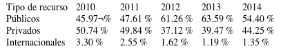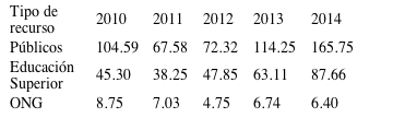 Al revisar los tipos de recursos para la financiación de las ACTI, Salazar et al., (2011) diferencian entre recursos públicos, privados e internacionales. En el año 2010, el 45.97 % de las ACTI fueron financiadas con recursos públicos, mientras que el 50.74 % con recursos privados y un 3.30 % de recursos internacionales. Por su parte, en el año 2011 un 47.61 % de ACTI se ejecutó con recursos públicos, frente a un 49.84 % de recursos privados y un 2.55 % de recursos internacionales. Se observa, en este sentido, que la inversión internacional es muy poca y que la financiación por parte del sector privado podría incrementarse, teniendo en cuenta que son un agente importante en el ecosistema de innovación (ver Tabla 2). En cuanto a los años 2012 y 2013, se muestra un incremento en la inversión pública, pasando en 2012 de 61.26 %, al 63.59 % en 2013. Lo anterior evidenció que tanto los recursos privados como internacionales representaron un porcentaje menor en este bienio que en el anterior. Los recursos privados alcanzaron el 37.12 % en 2012 y el 39.47 % en 2013, mientras que los recursos internacionales representaron el 1.62 % en 2012 y el 1.19 % en 2013. Es importante destacar lo siguiente: cuando se emitió la Ley 1530 (2012), esta apoyó la organización del Sistema General de Regalías (SGR), lo cual ayudó a una distribución más equitativa de los recursos de CTI en el país (DNP y DSEPP, 2012). En cuanto al año 2014, se reportó que los recursos públicos fueron equivalentes al 54.40 %. Al revisar los recursos privados, se observa un leve incremento en la inversión de dichos recursos, reportando en 2014 el 44.25 %. Los recursos internacionales, por su parte, evidenciaron el 1.35 % en 2014 (Lucio et al., 2015).