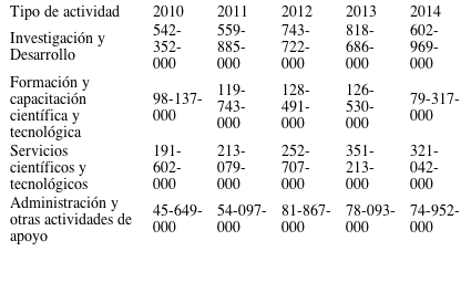 Al revisar el discriminado de la inversión nacional en ACTI en USD, se puede evidenciar que para el año 2014 la actividad investigación y desarrollo tuvo una inversión de USD 602969000. Para este mismo año, la inversión en formación y capacitación científica y tecnológica fue de USD 79317000. Según el Informe de Gestión 2015 (Colciencias, 2015), de las 983 becas asignadas para estudios doctorales, 725 fueron para programas en universidades colombianas y 258 para estudios en IES en el extranjero. Un programa liderado por Colciencias, denominado «Es Tiempo de Volver», desarrollado en el 2014, apoyó el retorno de 123 investigadores colombianos con doctorado obtenido en el exterior para vincularse a 28 entidades en Colombia entre universidades, centros de investigación, gobierno, etc., (Colciencias, 2015). La inversión en servicios científicos y tecnológicos evidenció un incremento, reportando en 2014 una inversión de USD 321042000. Ese año, la administración y otras actividades de apoyo contaron con una inversión de USD 74952000. Igualmente se evidenció más inversión en las actividades de innovación, la cual fue de USD 454.289.000; se debe tener en cuenta que la inversión en innovación no volvió a ser tan alta durante los años estudiados, como en 2010, la cual fue de USD 526198000. Entre los años 2010 y 2014 se apoyaron a 1416 empresas con instrumentos de innovación; esto generó un cumplimiento de la meta establecida por el gobierno en un 105.7 % (Departamento Nacional de Planeación-DNP & Dirección de Seguimiento y Evaluación de Políticas Públicas-DSEPP, 2015). Asimismo, en 2014 se generó una inversión general de USD 1532570000 (Lucio et al., 2015).