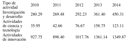 En lo relativo a actividades de innovación se pueden observar valores bastante altos, en particular porque aquí se incluyen aspectos como: «adquisición de maquinaria y equipo; adquisición de hardware; adquisición de software; adquisición de tecnología desincorporada; consultorías y asistencia técnica; ingeniería y diseño industrial; capacitación del personal; y, estudios de mercado» (OCDE, 2015). Tomando en cuenta lo mencionado, son notables las inversiones realizadas a partir del año 2010, en el cual se destinaron USD 927.75 millones en este tipo de actividades; para el año 2011 hubo un leve decrecimiento al llegar a invertirse USD 898.40 millones; sin embargo, a partir del 2012 se presenta un crecimiento constante durante tres años consecutivos, desde el 2012 al 2014, en los cuales se invirtieron USD 1017.76, USD 1361.14 y USD 1349.87 millones, respectivamente.