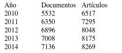 Al revisar el tema de la producción bibliográfica en Colombia entre los años 2010-2014 (ver Tabla 7), como resultado de las inversiones realizadas en CTI, según la información reportada en la base de datos Web of Science, y del informe de Lucio-Arias et al., (2016), se observa que durante este periodo las cifras de los documentos y artículos registrados fueron aumento: en 2010 se registraron 5532 documentos y 6517 artículos; en 2011, el número de documentos incrementó a 6350 y el de artículos a 7295; en 2012, los documentos y artículos subieron a 6896 y 8048, respectivamente. En los años siguientes, la cifra siguió en aumento, identificando que, para el año 2013, 7008 documentos y 8175 artículos aparecían registrados en la plataforma Web of Science. Esto demuestra que la difusión de las investigaciones es un tema relevante, lo cual está relacionado con la cantidad de proyectos de investigación que se tengan en curso. También estos datos van muy de la mano con los criterios de autoevaluación y acreditación de programas, establecidos por el Ministerio de Educación Nacional (MEN) y el Consejo Nacional de Acreditación (CNA). Asimismo, como es sabido, para que los grupos de investigación y los investigadores en Colombia pudieran subir en las categorías establecidas por Colciencias, las publicaciones eran y siguen siendo uno de los indicadores más importantes.