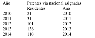 Al revisar el aspecto de las patentes asignadas por vía nacional en Colombia 2010-2014 (ver Tabla 8), se observa que: en el año 2010 se entregaron 21 títulos de patentes a residentes y 60 a no residentes; en 2011 se asignaron 31 patentes a residentes, frente a 45 a no residentes; para el 2012, 101 patentes fueron asignadas a residentes y 130 a no residentes. En los dos últimos años objeto de estudio la cifra no sufre cambios marcados: en 2013 se asignaron 136 a residentes y 107 a no residentes; finalmente, en 2014, se entregaron 110 a residentes y 65 a no residentes; esto demuestra la baja producción científica y el desconocimiento generalizado del sistema nacional de producción intelectual en Colombia.