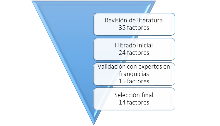 Para llegar a la selección final de 14 factores se siguió un proceso para depurar la lista inicial de los 35 factores iniciales propuestos. De primera instancia, se realiza una minuciosa revisión de la literatura con la finalidad de encontrar factores de éxito en las franquicias y ser agregados a la lista, de la cual se encontraron un total de 35 factores de éxito; sin embargo, antes se debía corroborar su relación con la industria de alimentos y bebidas, así como los artículos con enfoque cuantitativo. El filtrado inicial se elaboró desde la perspectiva personal, se analizó el factor y el enfoque que cada autor le daba a cada factor y este era comparado con el enfoque del artículo, si el factor era compatible con el enfoque del artículo se mantenía en la lista de factores, de los 35 factores iniciales, se obtuvo 24.