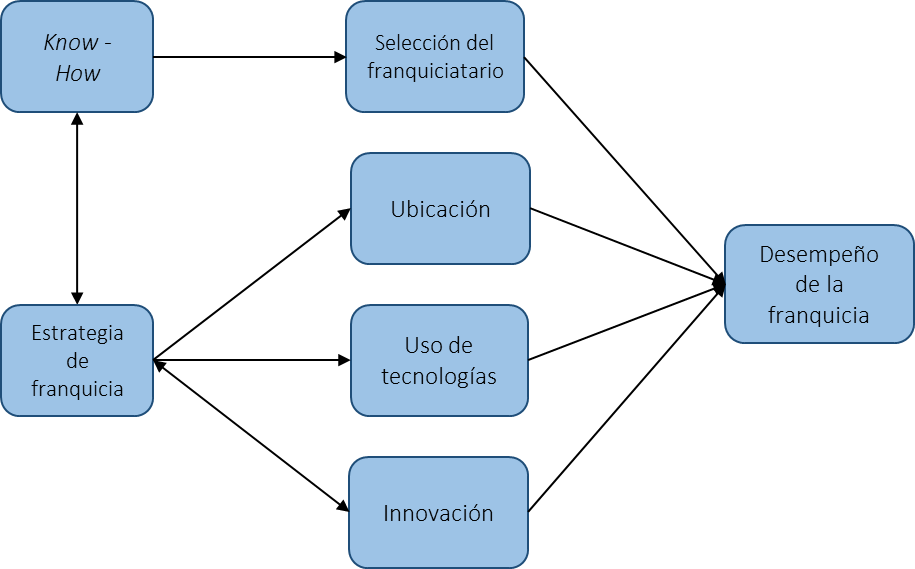 Como bien se mencionó en líneas anteriores, debido a que existe un enfoque similar podemos iniciar por desarrollar aquellas variables en las que se fortalece un artículo con otro. El know-how es el factor básico de la franquicia, ya que comprende toda la información en detalle con el que se ha obtenido el éxito de nuestro negocio y que será transmitida a otra persona para que pueda lograr el éxito. Como prueba de esto, se menciona lo siguiente: «… el franquiciador cede a los franquiciados unas capacidades de gestión y el respaldo de un nombre de marca que permite que persona sin experiencia previa puedan dirigir un negocio con éxito» (Guerrero et al., 2014, p. 48), y esto se logra documentando y conociendo a la perfección cada dato que involucre a la franquicia y que además esto debe tener un acompañamiento con el factor de la selección del franquiciatario, ya que para Morrison (1997) en Guerrero et al. (2014), para que se pueden lograr buenos resultados tanto el franquiciante como el franquiciatario deberán cumplir un rol específico, esto refuerza la propuesta de relación entre el know-how y la selección del franquiciatario en el modelo de la Figura 2.