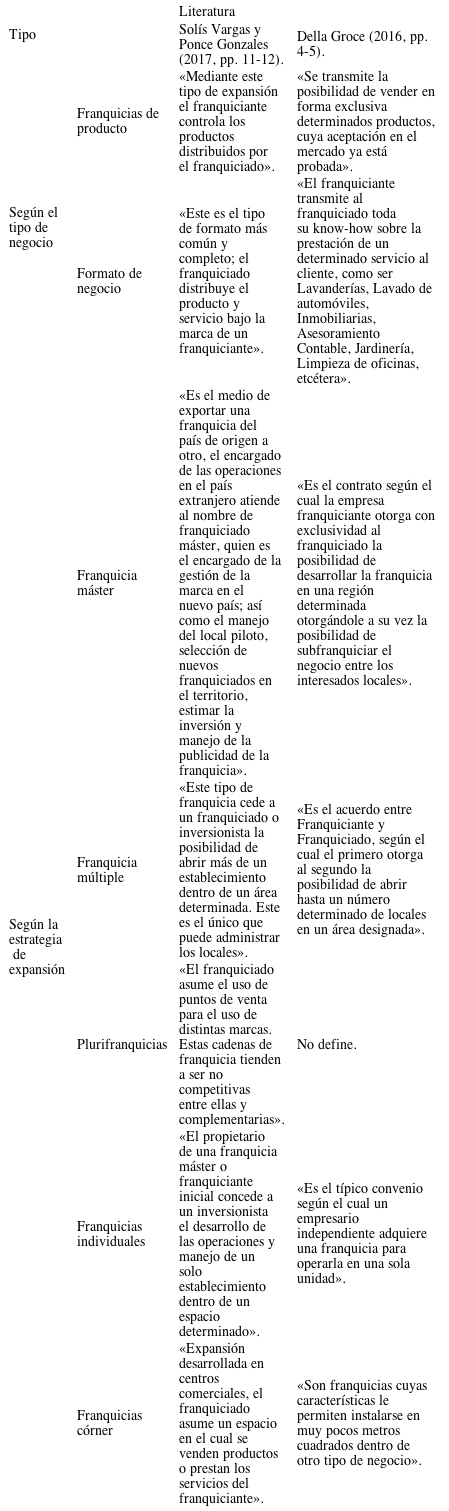 Mediante la revisión de literatura se logra encontrar dos grandes tipos de franquicias; el primero se enfoca según el tipo de negocio, que se puede relacionar con el «qué», ¿qué se vende?, ¿un producto, una parte de este o toda la idea negocio?, el segundo, se relaciona según la estrategia de expansión, que se puede relacionar con el «cómo y las reglas de juego para el franquiciatario», es decir, la forma y la cantidad de sucursales en que el franquiciatario podrá llevar a cabo la franquicia. En la Tabla 1 se realiza un abordaje mayor a la tipología de franquicias que comúnmente se puede encontrar.