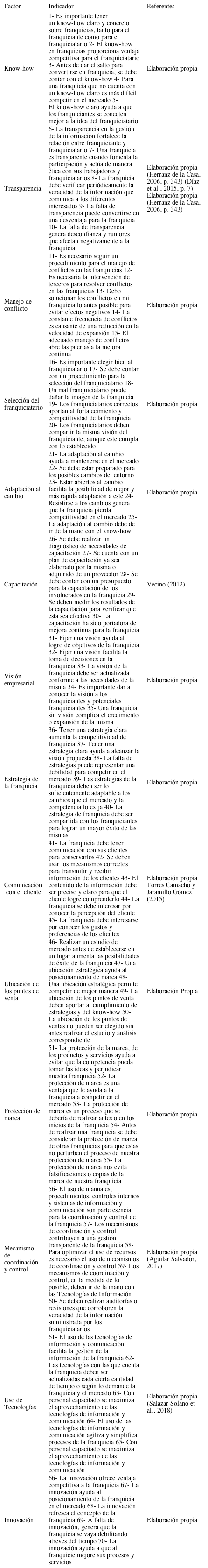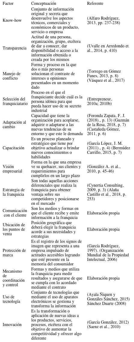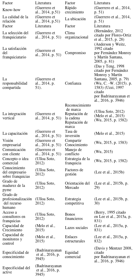 Tal y como se mencionó en las líneas anteriores, para poder medir el éxito en una franquicia los autores se apoyan en la contribución de varios factores. Estos factores son pequeñas acciones que aportan en conjunto al éxito de las franquicias. Lo anterior fue encontrado por medio de una revisión de literatura y, para ser tomados en cuenta, debían estar relacionados en el área de interés, en este caso, la industria de alimentos y bebidas; además, debía ser producto de un estudio cuantitativo y ya que son el fuerte de nuestro artículo, son presentados junto a sus respectivos autores en la Tabla 3.