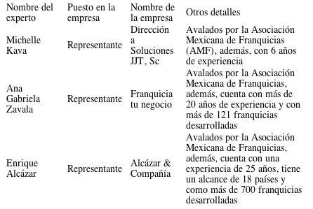 El tema de franquicias es novedoso en investigación, prueba de ello es que no hay ninguna revista con índice H5 que aparezca en las listas de relevancia en español, y en inglés solamente aparece la revista Franchise Law Journal con un índice H5 de 6. Dada la situación anterior, para validar la información, fueron realizadas entrevistas a profundidad con expertos en franquicias, estos fueron contactados por medio de correo electrónico para verificar su disposición de colaborar en la investigación. Al momento de estar en conversación con ellos, se explica el objetivo y de qué forma colaborarían con la investigación; los factores fueron planteados y los expertos, desde su experiencia, los aprobaban o descartaban debido a sus papeles en la investigación. A continuación, en la Tabla 5 se muestra el perfil de los entrevistadores participantes, con el objetivo de demostrar sus experiencias en el área.