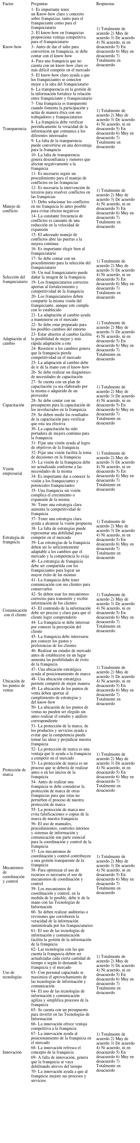 Se plantea un instrumento que consta de 70 preguntas e integra los 14 factores de éxito formulados. Los ítems (ver Tabla 7) fueron formulados de forma afirmativa para que estos puedan ser analizados mediante herramientas estadísticas y se realice la validación respectiva. Dada la novedad del tema de franquicias en investigación, no se encontraron instrumentos validados cuyas publicaciones mencionaran los valores de fiabilidad de sus ítems; por tal motivo, se propone un instrumento propio que deberá ser validado empíricamente. Este se observa en la Tabla 8.