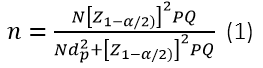 dp es la precisión de estimación del total poblacional que se está dispuesto a aceptar, P es la proporción de interés, Q=1-P, y Z 1-?/2 es el cuantil 1-?/2 de la distribución normal estándar.