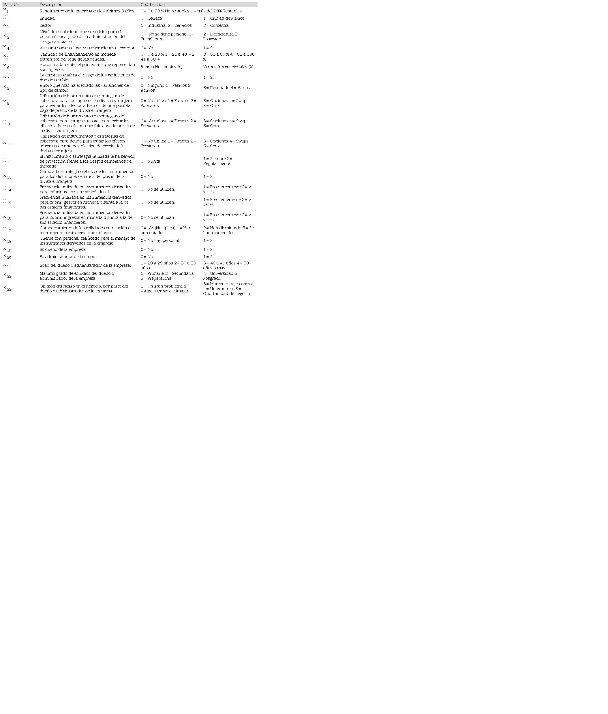 En el análisis estadístico se incluyeron variables sobre el perfil de los administradores como fue la escolaridad, su edad, el máximo grado de estudios, opinión sobre el riesgo de negocio y la existencia de personal calificado para el manejo de instrumentos financieros derivados, el uso o carencia de asesoría para realizar las operaciones con el exterior; en lo referente a las operaciones que las compañías se consideró la cantidad de financiamiento extranjero, los ingresos en moneda extranjera, utilización de instrumentos financieros derivados para cubrir los riesgos de los ingresos y las deudas en moneda extranjera y su frecuencia de uso.