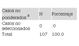 El análisis Logístico Binario se desarrolló en el programa SPSS, mediante el método «por pasos hacia adelante» con el criterio de Wald, en el modelo se van añadiendo al mismo variables independientes según su grado de relación con la variable dependiente y su significación estadística. En la Tabla 2 aparecen 107 casos introducidos, que son los seleccionados para el análisis y los casos excluidos, en este caso son cero.