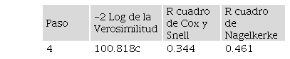 En la Tabla 3 se presenta la verosimilitud del modelo, el estadístico -2LL mide hasta qué punto se ajusta bien de los datos, cuanto más pequeño sea el valor, será mejor el ajuste. La R cuadrado de Cox y Snell es un coeficiente de determinación generalizado, con un valor de 0.344 que indica que un 34,4 % de la variación de la variable dependiente es explicada por las características de la administración. La R cuadrado de Negelkerke, es una versión corregida de la R cuadrada de Cox y Snell, en este caso con un valor de 0.461 que equivale a 46,1 %.