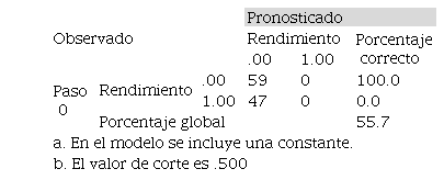 La Tabla 4 de clasificación es muy parecida a la empleada para valorar una prueba diagnóstica, es la que permite evaluar el ajuste del modelo de regresión logística. En este paso el modelo ha clasificado correctamente a un 55,7 % de todos los casos.