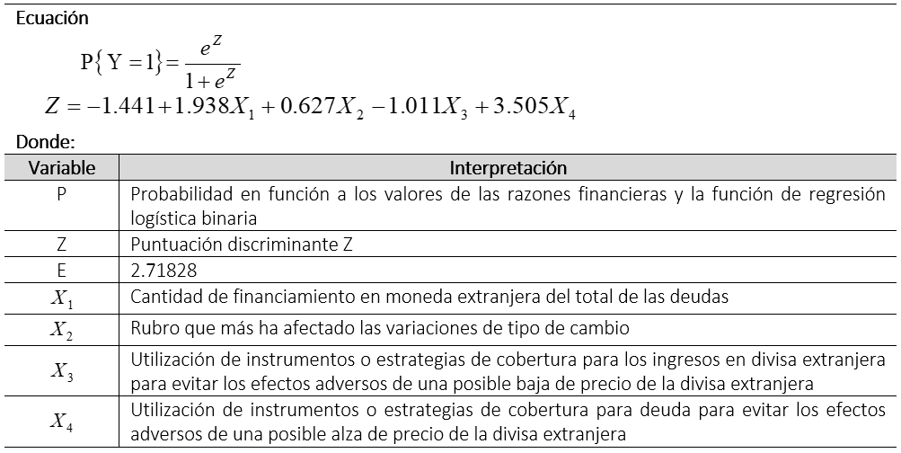 La ecuación de regresión logística se usa para predecir la probabilidad de pertenecer al grupo de las empresas Rentables =1 o No Rentables = 0, de una empresa en función al valor de las características predominantes en su administración de riesgos cambiarios en ambientes de contingencia. Si una empresa tiene un valor de menos de 0.50 al sustituir los valores de sus valores medios en la ecuación de regresión logística, se clasificaría como No rentable; por el contrario, si el resultado fuera mayor a 0.50, se clasificaría como Rentable, donde se consideran empresas Rentables las que tienen márgenes de rentabilidad superiores al 20 % y no rentables a aquellas con rendimientos entre 0 y 20 %.