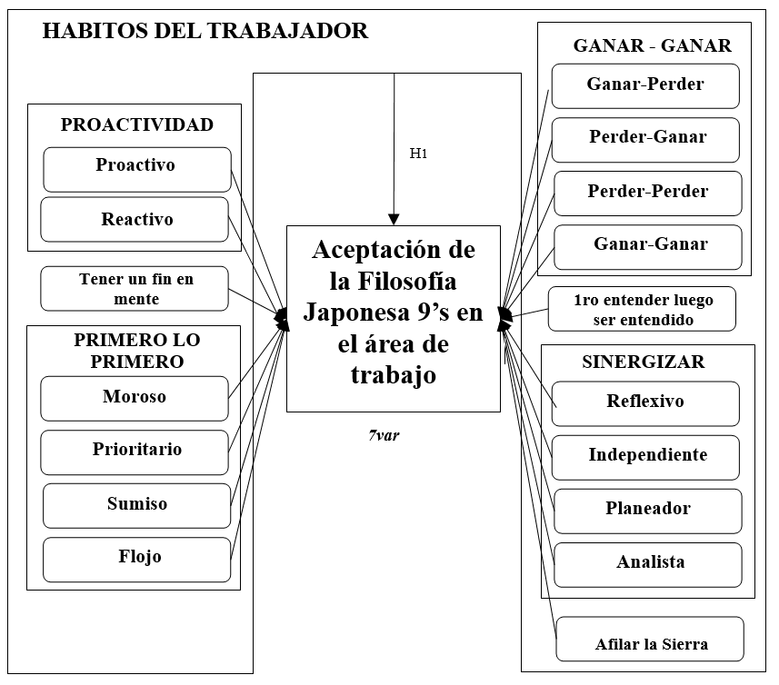 En la Figura 1 se muestra el modelo teórico aplicado a la presente investigación, el cual muestra la relación de la hipótesis que existe entre los bloques principales de «Hábitos de los trabajadores» (la cual integra 7 dimensiones adaptada de Covey, 2012) y «Aceptación de la filosofía japonesa 9?s» en las áreas de trabajo.