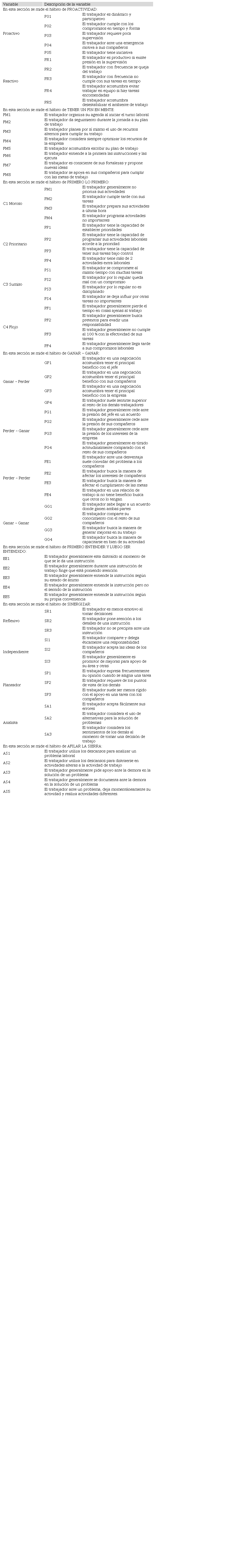 Los resultados descritos en Tabla 3 muestran que las dimensiones de «reflexivo» y «afilar la sierra» tiene valores bajos o que demanda un análisis más a detalle sobre la intención de la escala y de la aplicación en esta sección de la encuesta por parte del evaluador para con el objeto de estudio. En la Tabla 4 se muestran los valores descriptivos de cada una de las dimensiones.