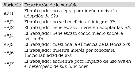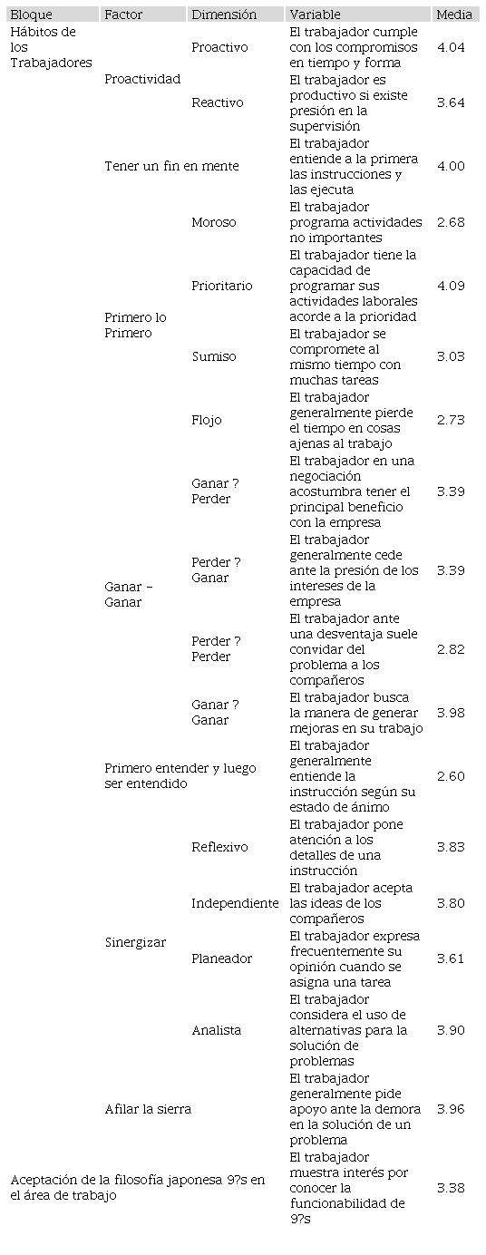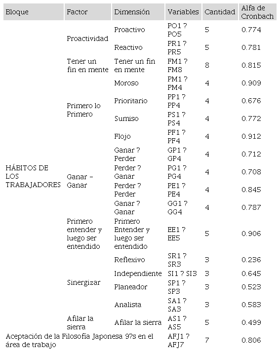 Para el presente estudio se utilizó un instrumento de evaluación integrado por 2 bloques, los cuales se midieron con escala Likert de 1-5, con operacionalización desde total desacuerdo hasta un total acuerdo. El primer bloque denominado «hábito de los trabajadores» está compuesto por 7 dimensiones, el cual se muestra en la Tabla 1: ( Covey, 2012). El segundo bloque está identificado como «Aceptación de la filosofía japonesa 9?s en las áreas de trabajo» ( Aguilera, González & Hernández, 2012), el cual se muestra en la Tabla 2. Es importante resaltar que actualmente el instrumento está en su fase experimental.