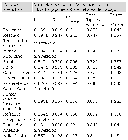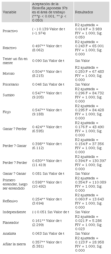 En la Tabla 6 se puede observar que en la relación de las dimensiones del modelo con la variable dependiente, en particular las dimensiones: Tener un fin en mente, Prioritario, Ganar-ganar, Independiente y Analista, el análisis de correlación no tiene significancia o sentido como para poder afirmar que estas relaciones inciden de manera significativa en la aceptación por parte de los trabajadores en adoptar en sus actividades laborales la filosofía japonesa 9?s. Por otro lado, las dimensiones que sí tienen impacto en la aceptación de una filosofía como las 9?s son Perder ? Perder; primero entender y luego ser entendido. Esto significa que, en el modelo teórico propuesto para estas empresas, y especulando temas de cultura, si bien como se mencionó en los análisis descriptivos existe interés por parte de los trabajadores de ser más sinérgicos, colaboradores y más proactivos, en realidad tienen alta tendencia a ser más individualistas, no colaboradores, así como mayormente centrados en sus propias necesidades más que en las de la empresa.