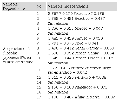 Los resultados de la Tabla 7 muestran que no existe una relación de impacto de las dimensiones (Tener un fin en mente, Prioritario, Ganar-ganar, Independiente y Analista) con la variable dependiente (Aceptación de la filosofía japonesa 9?s en el área de trabajo), lo que significa que estas relaciones no son significativas para este modelo aplicado a esta muestra con este objeto de estudio en la pyme manufacturera de Aguascalientes. En la Tabla 8 se muestran las ecuaciones derivadas de la relación de cada dimensión del bloque de «Hábitos» con la variable dependiente identificada como «Aceptación de la filosofía japonesa 9?s en el área de trabajo».