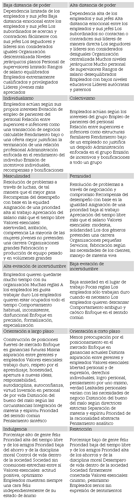 Para el estudio de diferencias culturales, Geert Hofstede tuvo la oportunidad de aplicar y analizar una gran cantidad de encuestas sobre los valores de los empleados de la empresa IBM en más de 70 países y regiones, entre ellos Alemania y México. A través de un procedimiento estadístico y de análisis factorial, se agruparon las preguntas y se les denominó clústeres. Se trató de un estudio cuantitativo analizando las respuestas de los encuestados a través de una escala pre-codificada de 1, 2, 3, 4 y 5. Las cuatro áreas que detectó Hofstede fueron las siguientes: 1) distancia de poder; 2) colectivismo versus individualismo; 3) feminidad versus masculinidad; y 4) evitación de la incertidumbre. Dichas áreas son llamadas «dimensiones culturales», cuyo término inglés es dimensions of cultures. Como dimensión se entiende un aspecto de una cultura el cual se puede medir en comparación con otras culturas. Las dimensiones de Hofstede coincidieron con los descubrimientos de los científicos Alex Inkeles y Daniel Levinson 20 años antes. Posteriormente al descubrimiento y análisis de las cuatro dimensiones mencionadas, Minkov desarrolló otras dos categorías que complementan el modelo de Hofstede: 5) orientación a largo plazo versus orientación a corto plazo; y 6) indulgencia versus restricción. En la Tabla 1 se describen las seis dimensiones ( Hofstede, Hofstede and Minkov, 2010).