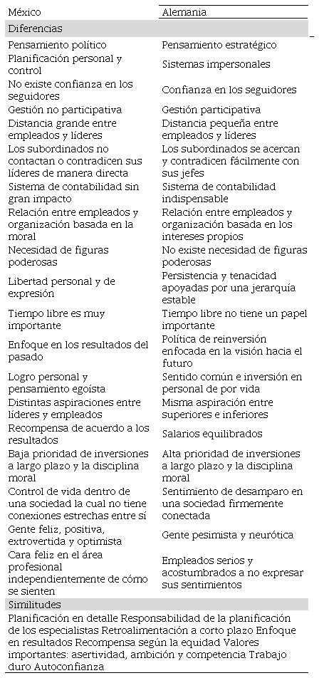 La Tabla 2 representa un resumen de las diferencias culturales entre México y Alemania, así como de las similitudes al final de la tabla, de acuerdo con la propuesta de Hofstede.