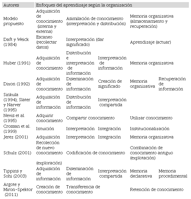 Ausubel (1999) plantea que el aprendizaje depende de la estructura cognitiva previa que se relaciona con la nueva información, debe entenderse por «estructura cognitiva» al conjunto de conceptos e ideas que un individuo posee en un determinado campo del conocimiento, así como su organización. Es decir que un tipo de aprendizaje según la organización se fundamenta en el concepto del aprendizaje mismo, la forma como se aprende y todo lo relacionado con la gestión del conocimiento de ese aprendizaje. Así, desde los trabajos iniciales de Cyert y March (1963);Cangelosi y Dill (1965);Argyris y Schön (1978); Crossan, Lane, y White, (1999); ( Zietsma, Branzei, y Vertinsky (2002)y Castañeda y Pérez (2005), han sido múltiples las investigaciones de este proceso en las organizaciones: aprendizaje, generación de conocimiento, adquisición, asimilación y aplicación de conocimiento en las organizaciones pero aún no entregan resultados relevantes y han terminado en escuelas académicas que generan confusión en las organizaciones. Estas escuelas han propuesto diferentes enfoques teóricos que plantean una serie de etapas o procesos, a través de los cuales se manifiesta el aprendizaje según la organización, pero, aunque difieren en la forma de agrupar sus enfoques, hay algunos puntos de coincidencia; a continuación, se relacionan en la Tabla 1.