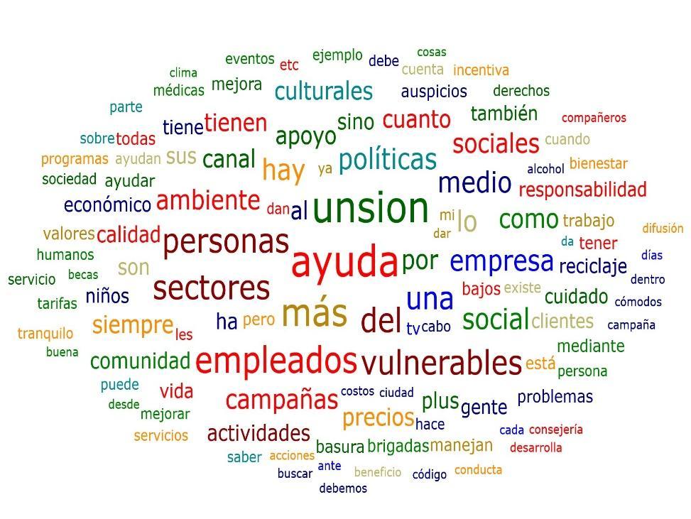 Respecto a la información recopilada en la Tabla 2, se identificó una nube de palabras representativas (ver Figura 1) con aquellas más reiteradas, en la que se omitieron adverbios y conectores, observándose que además del nombre del canal ?Unsion?, también se evidencia cierta reiteración de palabras como ayuda, empleados, vulnerables, personas y sectores.