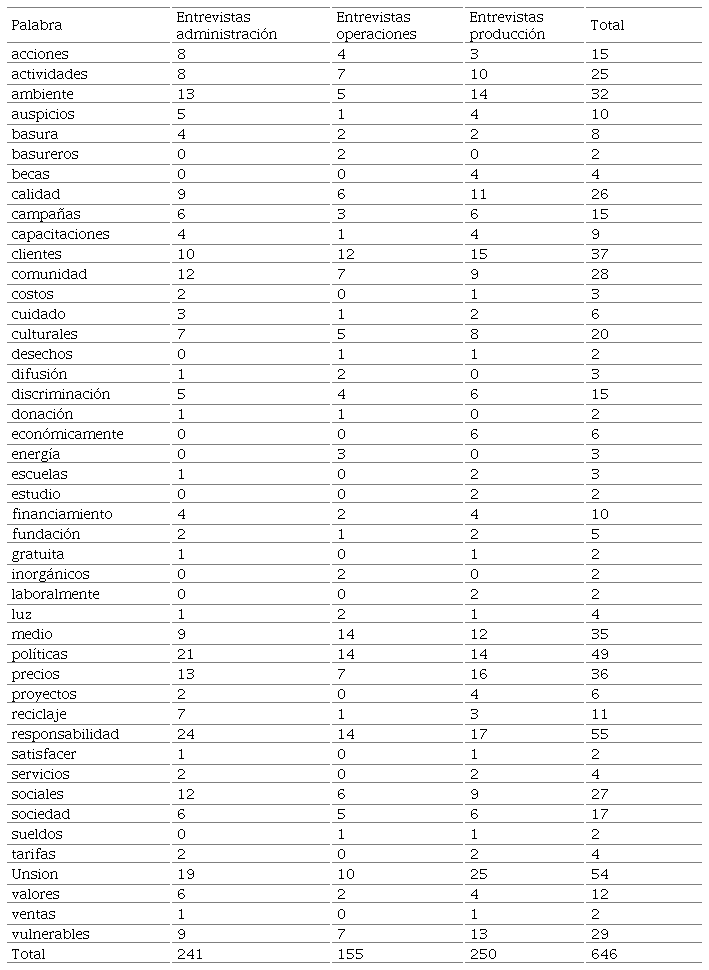 Para saber si la empresa aplica responsabilidad social corporativa y de qué manera lo hace, se procedió a realizar las entrevistas a profundidad al personal interno segmentado en administrativo, de operaciones y de producción, basándose principalmente en las dimensiones mencionadas anteriormente (Ver Tabla 1). De allí, se identificaron alrededor de 1512 frases, de las cuales 102 estaban asociadas a los principios sociales, económicos y ambientales (Ver Tabla 2).