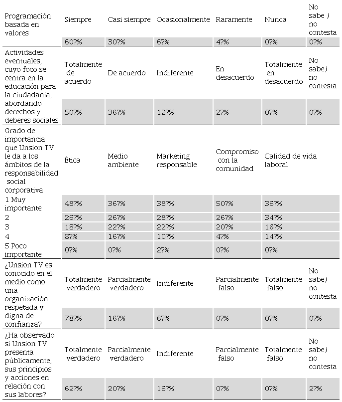 En cuanto a las herramientas de recopilación de datos, se utilizaron entrevistas en profundidad y encuestas en el desarrollo estructural del análisis. En primer lugar, las entrevistas estuvieron orientadas a los stakeholders o grupos de interés internos de Unsion TV, específicamente a los empleados, quienes deberían conocer con claridad las políticas internas y la gestión que realiza esta organización, como enfoque estratégico hacia una correcta aplicación de responsabilidad social corporativa. La entrevista se elaboró en relación con las necesidades e intereses de los grupos relacionados, así como a los diferentes campos de actuación que tiene la responsabilidad social corporativa en la parte interna de la organización; dicha entrevista en profundidad fue realizada con base en doce preguntas, en las cuales se desarrollaron los criterios principales de la responsabilidad social corporativa ( Carneiro, 2004). En cuanto a la confección de la entrevista, las tres preguntas iniciales se relacionaron al contexto de la responsabilidad social corporativa y a la aplicación realizada por Unsion TV; estas preguntas fueron: