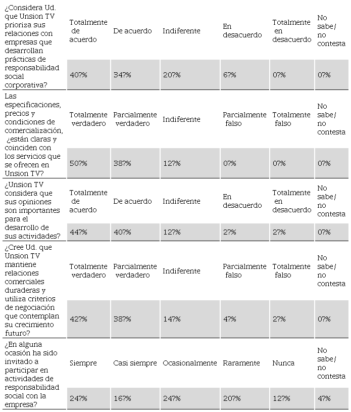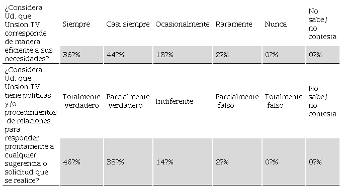 Otra de los ítems analizados demuestra que el 88 % afirma que Unsion TV presenta condiciones de negociación; es decir, se valora si el canal especifica los precios de forma transparente sobre los servicios, periodos de pago, entre otras cuestiones. Por otro lado, el 44 % de los encuestados están totalmente de acuerdo con el hecho de que Unsion TV considera importante las opiniones que realizan al medio para así mejorar sus relaciones. Estas opiniones y sugerencias las toman mediante sus perfiles sociales y comentarios expuestos directamente hacia los directivos.