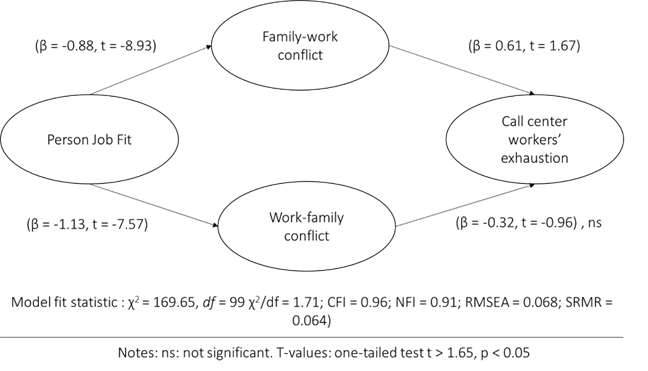 Based on Figure 2 the structural model test yielded good results (?2 = 169.65, df = 99, ?2/df = 1.71; CFI = 0.96; NFI = 0.91; RMSEA = 0.068; SRMR = 0.064). According to such results, person?job fit has a negative impact on both family?work conflict (? = -0.88, t = -8.93) and work?family conflict (? = -1.33, t = -7.57), which supports hypotheses 1 and 2. Additionally, only family?work conflict shows a positive impact on emotional exhaustion (? = 0.61, t = 1.67), while work?family conflict has no effect on emotional exhaustion among call center workers (? = -0.32, t = -0.96).