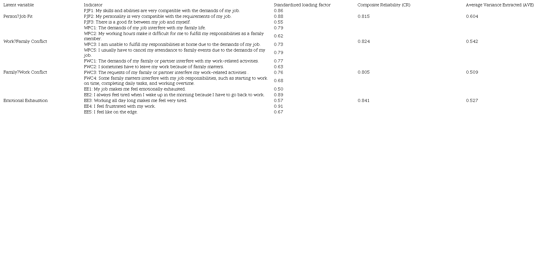 Based on the results of the CFA, some items were reduced because they had a loading factor below 0. 50 ( Hair et al., 1995; Igbaria et al., 1997): for instance, one question from the Work?Family Conflict and Family?Work Conflict variables, and three questions from the Emotional Exhaustion variable.