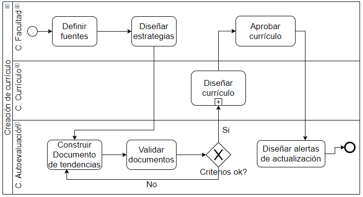 La validación del modelo de contexto consiste en su aplicación a un caso de estudio relacionado con la creación de un currículo para la apertura de un nuevo programa académico de tipo universitario. La Figura 5 presenta el diagrama general del proceso: creación de currículo. El proceso hace referencia a los pasos para diseñar un currículo en una universidad. Comprende diez actividades y tres actores. Las variables prioritarias que se deben gestionar por parte del contexto son la validación documental y la aprobación del currículo.