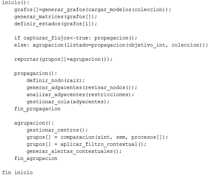 La Figura 4 presenta el algoritmo definido para el razonamiento inteligente. Se compone de dos subprogramas para la propagación de cambios y para el agrupamiento. El algoritmo trabaja con la colección de modelos y con las reglas definidas e inicia cuando se hace una representación en grafos a cada uno de los modelos de proceso, para así generar matrices de incidencia y adyacencia y poder continuar con la definición de estados factibles. Si el flujo de los procesos es igual, entonces se propagan los cambios, de lo contrario, se debe realizar un agrupamiento para definir un solo modelo de propagación.