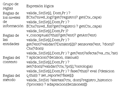 Con base en lo anterior, se proponen ocho (8) reglas de razonamiento, las cuales se organizan en cuatro grupos: niveles de información, entidades, contexto y gestión del método. La Tabla 4consolida las reglas para cada uno de los grupos. La representación en expresión lógica permite la implementación de estrategias de razonamiento como en el caso del encadenamiento hacia adelante.
