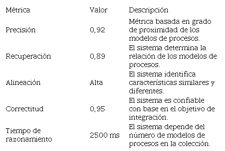 En síntesis, para la validación del método se definieron métricas de evaluación de acuerdo con las capacidades del sistema, donde se tiene en cuenta la gestión y representación de procesos, la búsqueda y recuperación, la integración y ejecución y el razonamiento en general. Las métricas definidas son:
