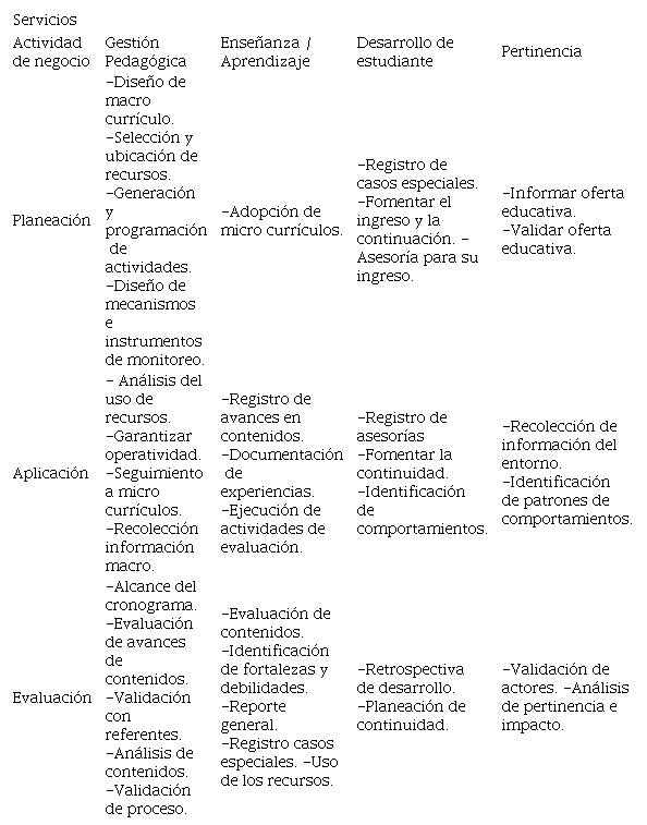 La Tabla 1 presenta las actividades de negocio de la gestión curricular frente a servicios que esta ofrece. Cada una de las celdas contiene información asociada a las acciones que deben llevarse a cabo para dar cumplimiento a dichos servicios. Cabe señalar que un servicio puede ser visto como un producto, dependiendo del tipo de organización que se esté analizando.