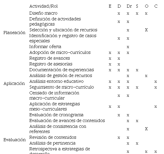 Los actores identificados para cada uno de los procesos son: Estudiante (E), Docente (D), Directivos (Dr), Sector (S), organismos disciplinares (O) y comunidad (C). El estudiante es quien se beneficia directamente de la gestión curricular, y es por los estudiantes que se ofrece una permanente actualización. El docente apoya la formación del estudiante, brindando experiencia e información necesaria para un aprendizaje exitoso. Los directivos son quienes permiten que los currículos sean administrativa y financieramente viables. Por su parte, los organismos disciplinares están relacionados con los entes del Gobierno que regulan el diseño e implementación del currículo. A su vez, la comunidad apoya e influye en el desarrollo del estudiante. La información que cada uno de ellos brinda puede afectar su contexto y por lo tanto las decisiones que puedan tomarse durante la ejecución de proceso. La Tabla 2 identifica la participación de los actores en las actividades de negocio de la gestión curricular.