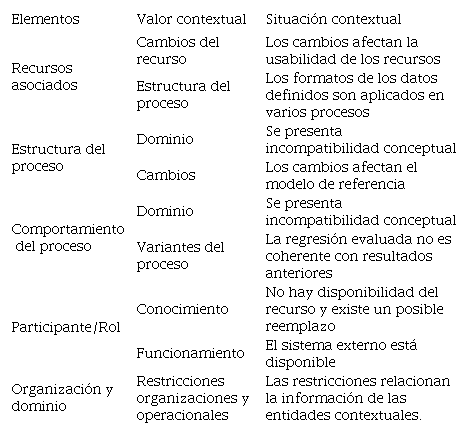En la Tabla 3se condensan las situaciones definidas para cada una de las entidades del contexto de la gestión curricular. El valor contextual debe considerar la información dispuesta en cada uno de los procesos y sus objetos. Así mismo, las situaciones contextuales se definen teniendo en cuenta los elementos contextuales y sus valores. Esto quiere decir que, a diferencia de los eventos, las situaciones analizan la información de varios objetos, con el fin de determinar las acciones que activaron una situación específica. Con base en las entidades identificadas y las situaciones relacionadas, se propone que el contexto de un proceso de negocio facilite el razonamiento inteligente por medio de los siguientes elementos: