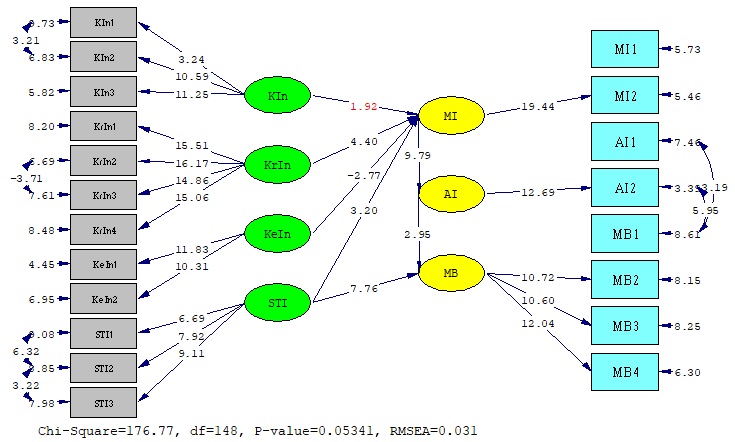 The analysis of all the validity tests (including the Chi-squared, ECVI, AIC and CAIC, Fit Index, and Goodness of Fit) showed good compatibility. There are close fit results with Root Mean Square Error of Approximation (RMSEA). From the results of the analysis above, it can be concluded that the fit test of all the models meets the requirements (good fit and close fit). Furthermore, in this study, we calculated the t-values in the following path diagram (see Figure 1).