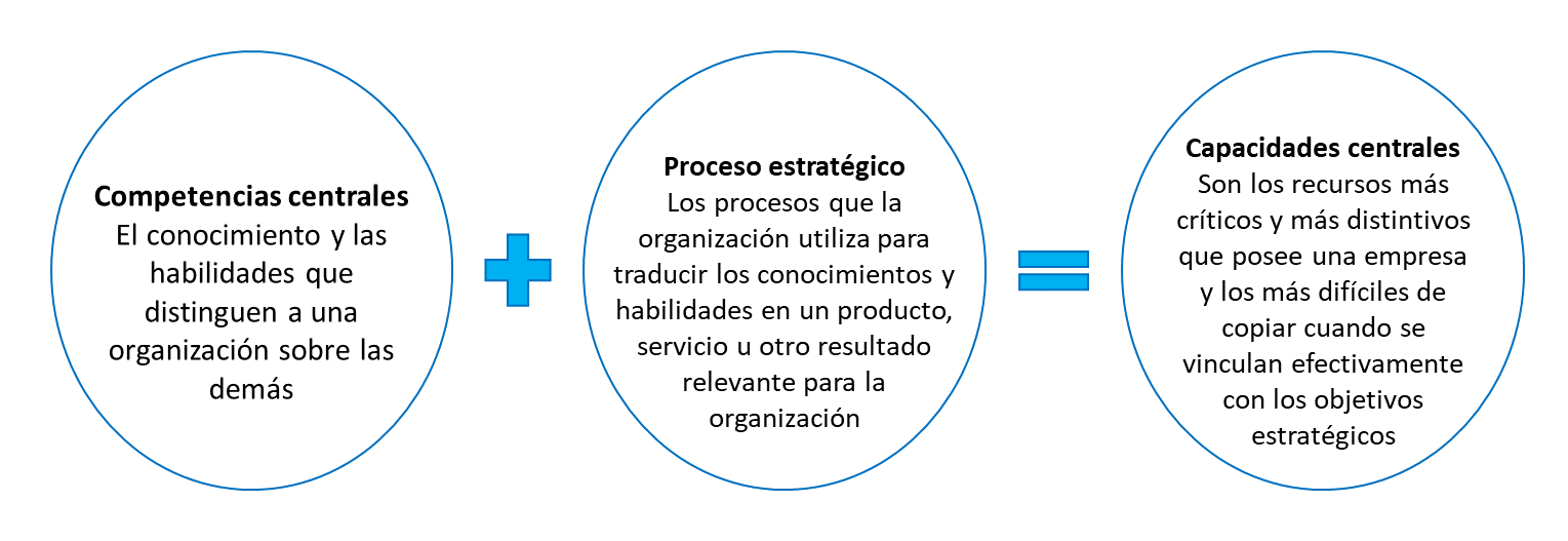 Long y Vickers-Koch (1995) sostienen que para que una capacidad sea central debe estar conformada por las competencias centrales y los procesos estratégicos de una organización (ver Figura 2). Esta visión ubica a las capacidades centrales no solo en el área de producción o de desarrollo tecnológico, sino que pueden existir en cualquier parte de la organización. Sin embargo, al existir en cualquier parte de la organización las capacidades centrales pueden ser difíciles de identificar como tales. Las capacidades centrales más fáciles de identificar se refieren a las capacidades de una organización para realizar una actividad funcional básica mejor que la competencia, como, por ejemplo, rapidez y flexibilidad para modificar diseños o logística de distribución. Por otro lado, las capacidades que involucran la habilidad de adaptarse, innovar o cambiar son más difíciles de identificar ( Marino, 1996). Este tipo de capacidades centrales necesitan forzosamente un componente de planeación para el futuro.