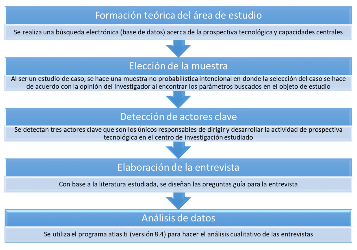 La investigación comenzó identificando a los actores principales que intervienen en la prospectiva tecnológica. Dentro del caso de estudio se detectan tres actores clave que son los únicos responsables de dirigir y desarrollar la actividad de prospectiva tecnológica en esta institución. El primero de ellos es el director de Planeación e Inteligencia Tecnológica. Los dos actores restantes son los investigadores líderes de proyectos dentro del área de investigación. Una vez identificados a los actores clave, se tuvo una primera entrevista con el director de Planeación e Inteligencia Tecnológica del CIDETEQ, en donde se conocieron las necesidades de prospectiva tecnológica de la organización. La entrevista semiestructurada tuvo como objetivo recabar información con respecto a los temas que se pretenden estudiar por parte del investigador ( Corbetta, 2003). Basado en este encuentro inicial, el trabajo se centró en diseñar entrevistas semiestructuradas para los tres actores principales identificados. Las entrevistas tuvieron lugar durante el mes de octubre de 2019 dentro de las instalaciones del CIDETEQ. La naturaleza semiestructurada de las entrevistas permitió reformular las preguntas cuando surgieron áreas previamente no contempladas en el curso de la discusión. Las preguntas que guiaron la entrevista fueron: ¿Qué habilidades considera necesarias para desarrollar el proceso de prospectiva tecnológica? ¿Qué métodos o herramientas utilizan para realizar la prospectiva tecnológica? ¿Qué fuentes de información se utilizan para realizar la prospectiva tecnológica? ¿Qué se hace con la información resultante de la prospectiva tecnológica? ¿Qué valor dan a la información obtenida del ejercicio de la prospectiva tecnológica?