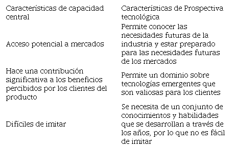 Se encuentra que la prospectiva tecnológica dentro del centro de investigación es una capacidad que provee de acceso potencial a diferentes mercados, hace una contribución significativa a los beneficios percibidos por los clientes del producto y es difícil de imitar (ver Tabla 1).