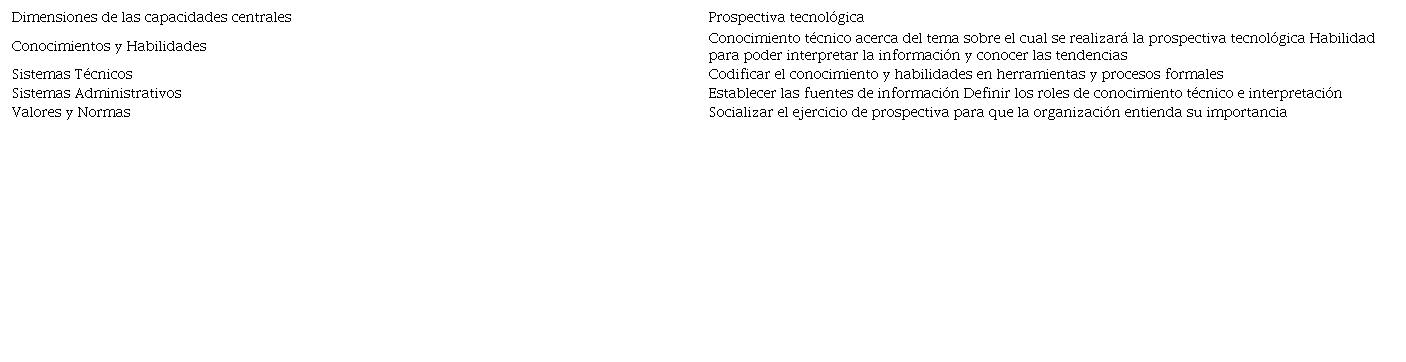 A continuación (ver Tabla 2) se resume la forma en que la prospectiva tecnológica se integra como una capacidad central, de acuerdo con las cuatro dimensiones fundamentales propuestas por Leonard-Barton (1992).